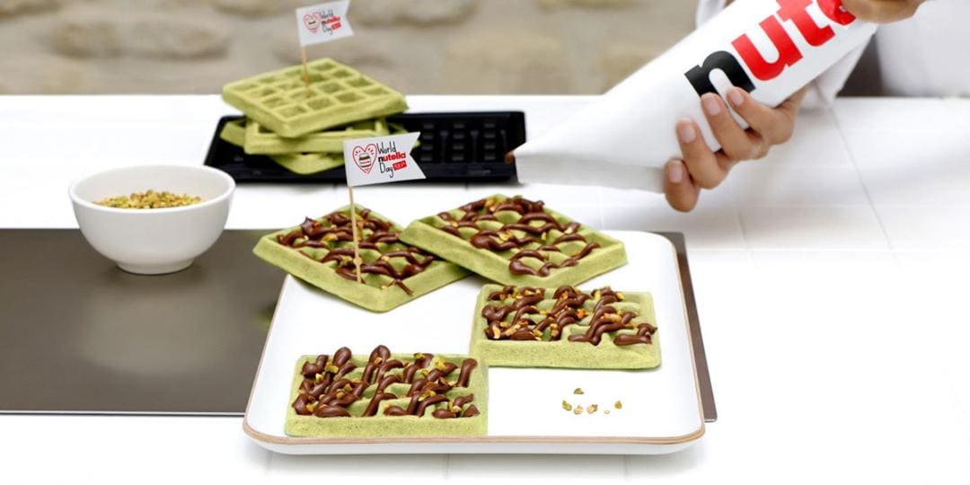 Sur chaque gaufre, ajoutez le Nutella® et parsemez de pistaches concassées.