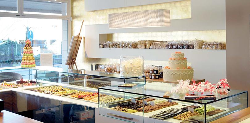 Bisogna quindi pensare a una vetrina principale orizzontale (la lunghezza e la forma dipendono dall'estensione della superficie del locale), dove sono contenute la pasticceria mignon, la cioccolateria e la pasticceria salata, ciascuna in spazi specifici. L'assortimento della pasticceria mignon deve essere disposta per tipologie (alla crema, alla frutta, al cioccolato, alle mandorle…), che rendono ancor più attrattiva l'offerta.