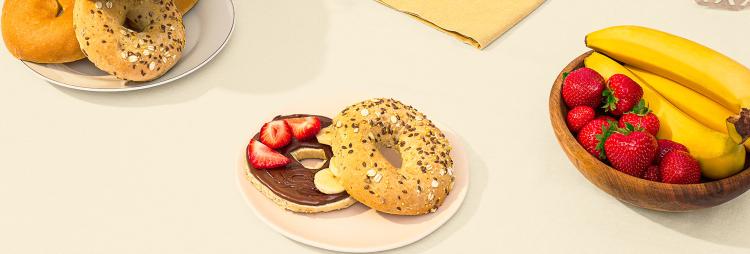 Cut the bagel in half. On each bageln side, spread a tbsp of Nutella. Prepare the fruits and decorate the bagels with them and some crushed hazelnuts.