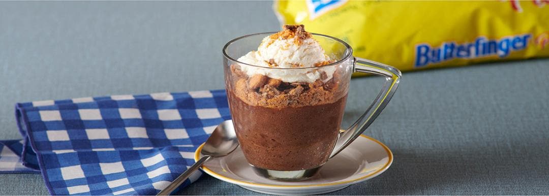 Lightly spray coffee mugs with food release spray and set aside. In a large bowl, blend all ingredients together until well incorporated. Pour batter into mugs ¾ full and place in a microwave oven. Set oven to medium low setting and bake for 1 minute 30 seconds. The sides of the cake should be set with the middle still soft and liquid. Cool the mug cakes on a wire rack and while still slightly warm, top each mug with Butterfinger® and serve warm. Add a scoop of vanilla ice cream if desired.