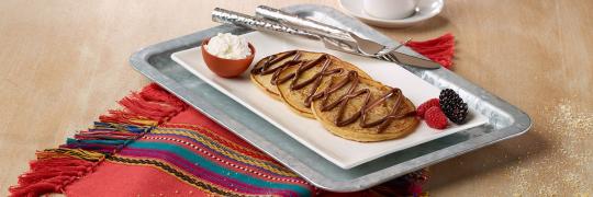 Whip the eggs until light and fluffy and set aside. In a separate bowl, combine the milk, yogurt and peach puree, then add the flour mix. Combine the egg mixture with the flour mixture and fold gently until batter is smooth. Pour 2 tbsp. of the batter into a sauté pan lightly sprayed with food release spray. Cook over medium heat until golden brown. Plate three pancakes and spread each one with ¼ oz. of Nutella®. Dust lightly with powdered sugar and more fresh sliced peaches if desired.