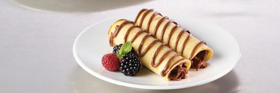 Separate the eggs and put the whites in a different bowl. Beat the yolks with the sugar. Beat the egg whites until stiff with the salt and leave to one side. Add the egg white to egg yolk mixture and mix gently. Leave to chill in the fridge for 15 minutes. When the mix is ready, mix both flours in a bowl, then add the egg yolk and sugar. In another bowl mix the milk with the oil and then add to the flour mix. Pour a Tbsp. of the batter into a greased non-stick pan or griddle and cook over medium heat. Cook until golden brown color. Plate two Johnnycakes and spread each one with 1/2 oz. Nutella®. Add fresh fruit if desired.