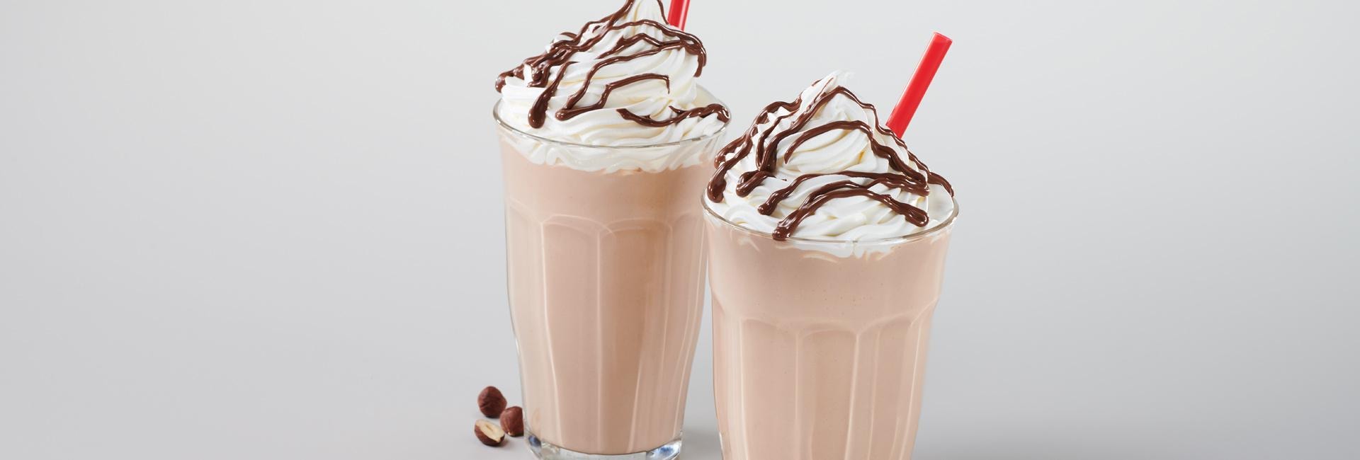 In a blender, combine the ice cream, skimmed milk and Nutella and mix until smooth and creamy. Drizzle Nutella in a drip pattern inside the glass. In a mixer with a whip attachment, whip heavy cream and powdered sugar until soft peaks form.