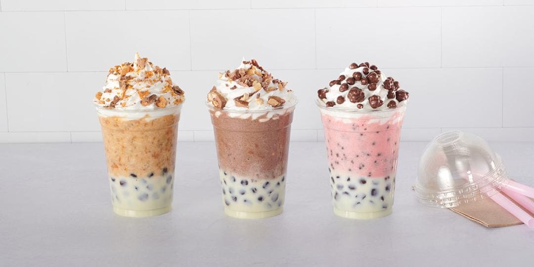 In a blender, combine each type of ice cream with the corresponding sauce. Mix until smooth and creamy. Into each mixture, gently fold in half of the chocolate pieces, keeping the other half for the garnish. Place 1/2 cup boba pearls on the bottom of each glass and top with 1 oz. evaporated milk, creating a layering effect. Gently fill the glass with the ice cream mixture. In a mixer with a whip attachment, whip cream at medium high speed until soft peaks form. Using a piping bag fitted with a star tip, pipe a swirl of whipped cream. Top the whipped cream with the remaining chocolate pieces and add 1 large boba straw to each glass. Serve cold