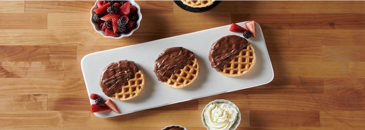 In a small pot, warm the Nutella® until 85 degrees F. Dip each waffle into the Nutella®, covering ½ of the waffle. Place the dipped waffle on a sheet pan covered in baker’s parchment and put in fridge until set. Lightly dust with powdered sugar if desired