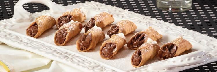 Prepare the Fiore di Latte Cream: In a small bowl, add 1/4 cup of cold milk and mix in powdered gelatin and let it sit for 5 minutes to form a sponge. Once this mix is spongy, melt to turn into a liquid. You can do this in the microwave. Set aside to cool down. Pour the 1 cup of milk into a large bowl. Add the powdered sugar and stir it through. Pour in the melted gelatin mix and whisk together. Place in the fridge for 20 minutes. Take out of the fridge, and using an electric mixer whisk it up until the yogurt mix gets thick and doubles in volume. Fit a piping bag with a star tip. Fill right side of cannoli with Fiore di Latte cream and the left side with Nutella®. Top with powdered sugar if desired.