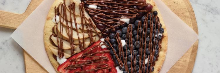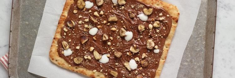 Prepare the Fiore di Latte Cream: In a small bowl, add 1/4 cup of cold milk and mix in powdered gelatin and let it sit for 5 minutes to form a sponge. Once this mix is spongy, melt to turn into a liquid. You can do this in the microwave. Set aside to cool down. Pour the 1 cup of milk into a large bowl. Add the powdered sugar and stir it through. Pour in the melted gelatin mix and whisk together. Place in the fridge for 20 minutes. Take out of the fridge, and using an electric mixer whisk it up until the yogurt mix gets thick and doubles in volume. Pre-heat the conventional oven to 350°F and bake the pizza crust for 5 to 7 minutes or until golden brown. Remove from oven and while still warm spread with Nutella® over pizza base. Then dollop with Fiore di Latte cream and chestnut quarters. Top with hazelnut biscotti crumbles and top with powdered sugar if desired.