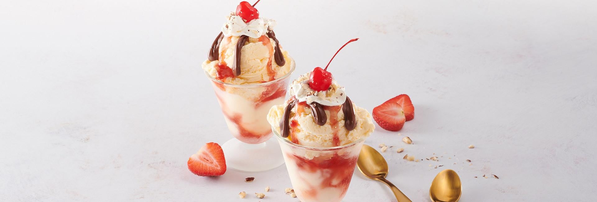 Blue Bunny™ Quickblend Vanilla Ice Cream is topped with warm Nutella®, strawberry sauce, fluffy whipped cream, a sprinkling of roasted peanuts, with a cherry on top.